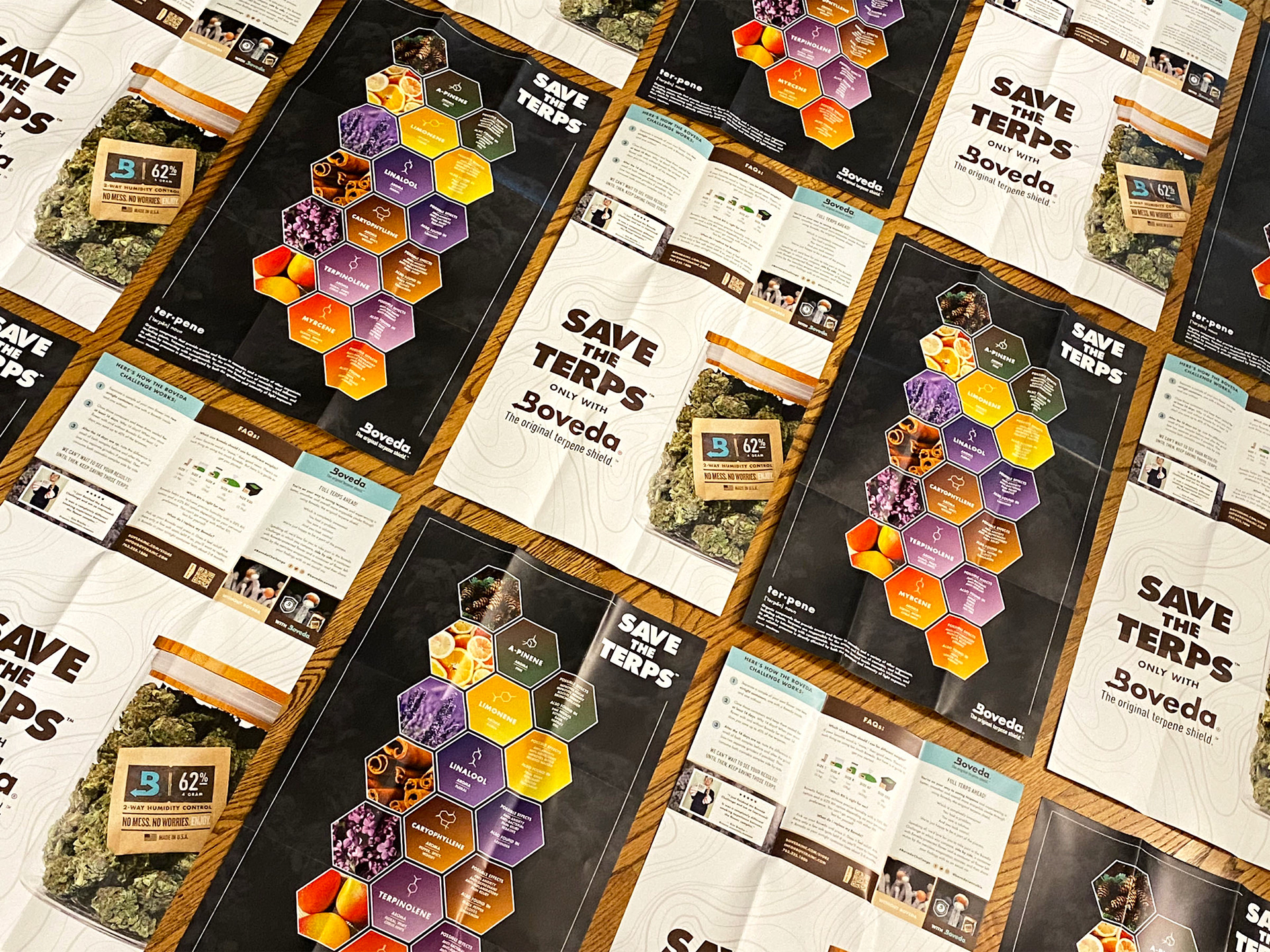 This poster was inserted into our product sample packs, and was also given out to a lot of dispensaries to be hung up and presented within their store fronts. One side highlights the six main terpenes within cannabis, and on the other side a description of our "Boveda Challenge" campaign.